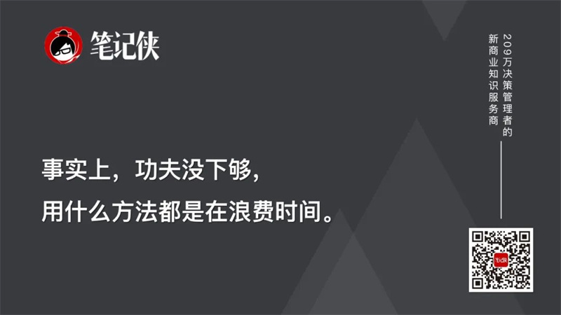 很多人崇拜速成,他們(men) 相信自己能找到別人找不到的捷徑,而不是沉住氣慢慢提升自己。事實上,功夫沒下夠,用什麽(me) 方法都是在浪費時間。